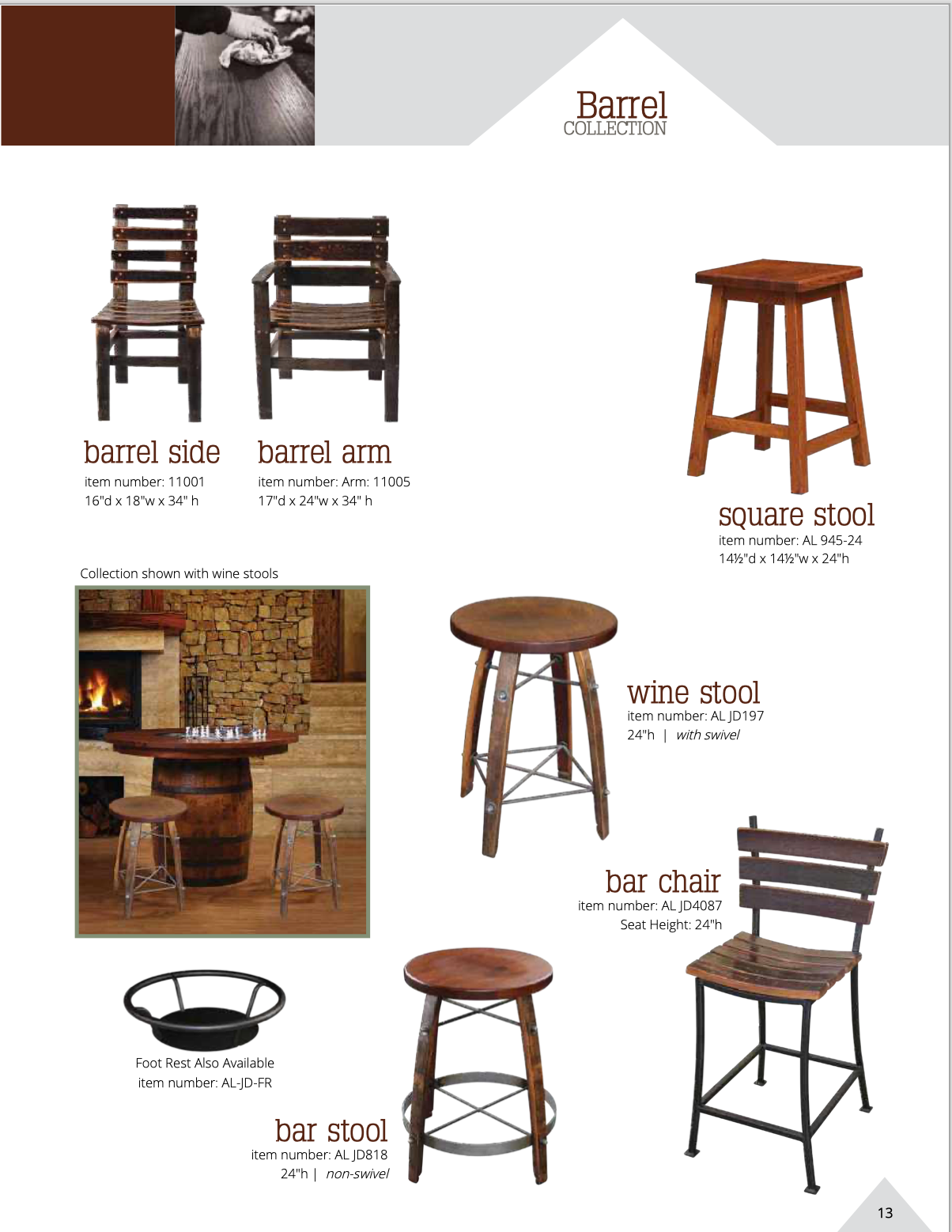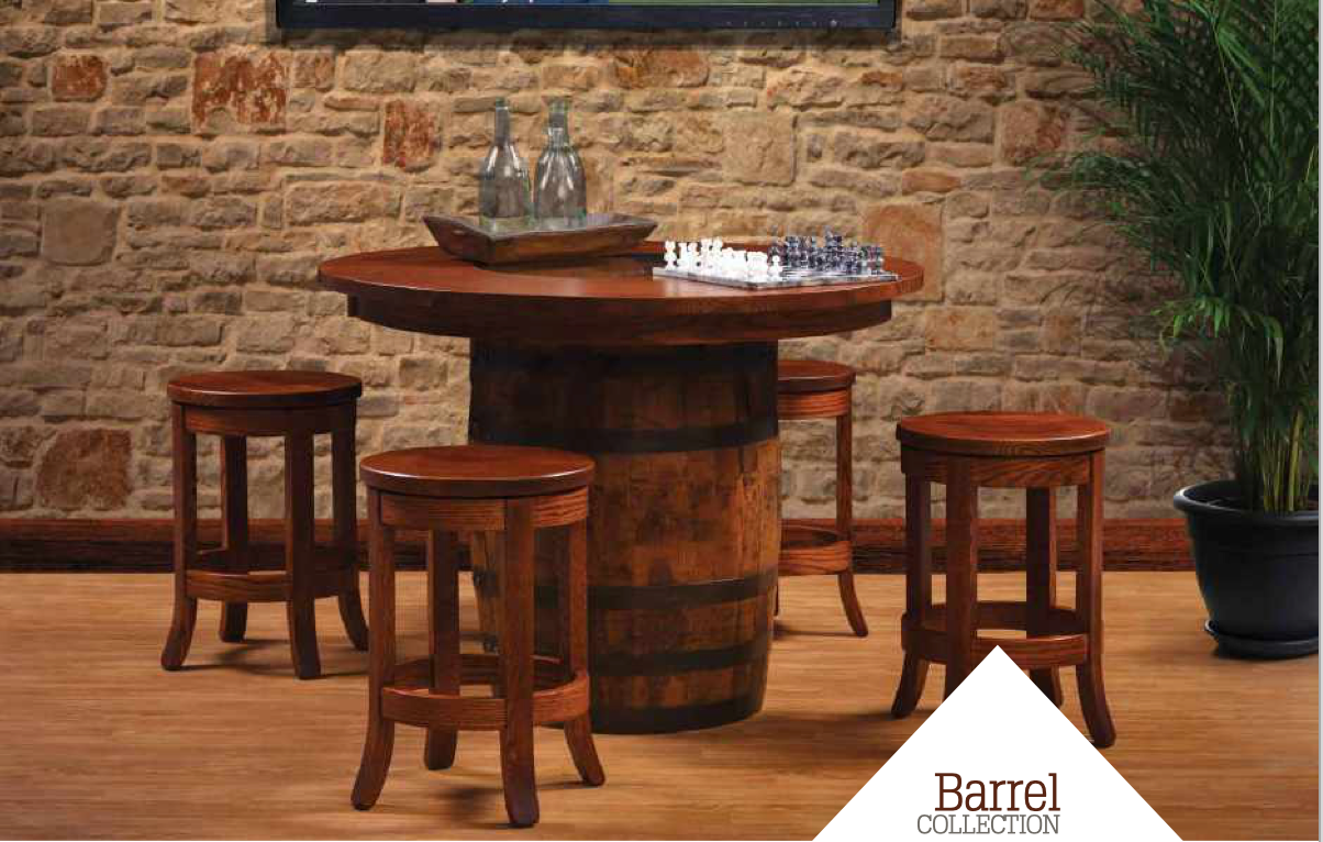 Set Includes 42" Round Barrel Table and 4 Bar Stools - Contact us to order in other table sizes and configurations!