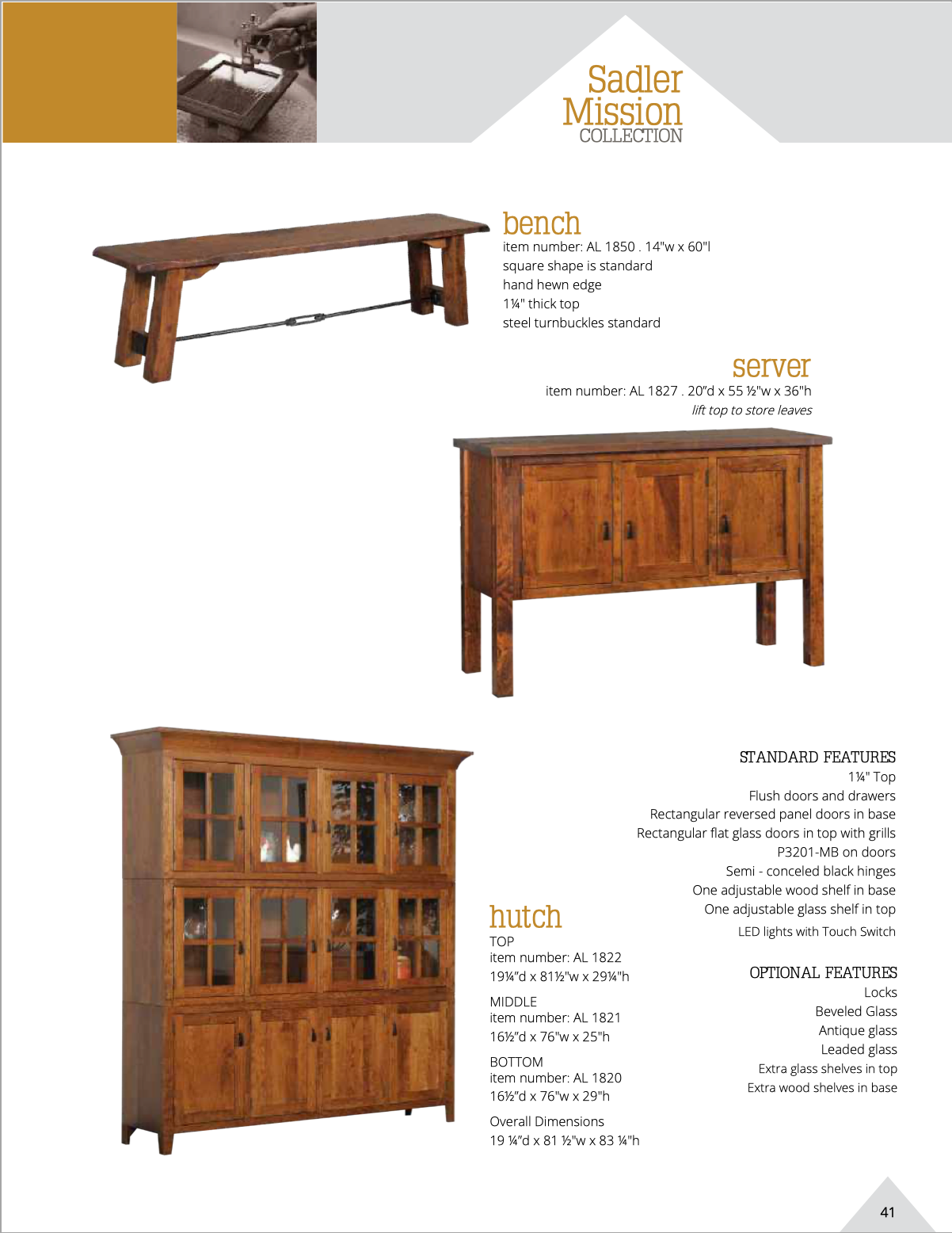 Set includes 42" x 72" Table with No Leaves, 2 Side Chairs, 2 Arm Chairs, 72" Bench, 4 Door Dining Hutch, Server - Contact us to order in other sizes and configurations!