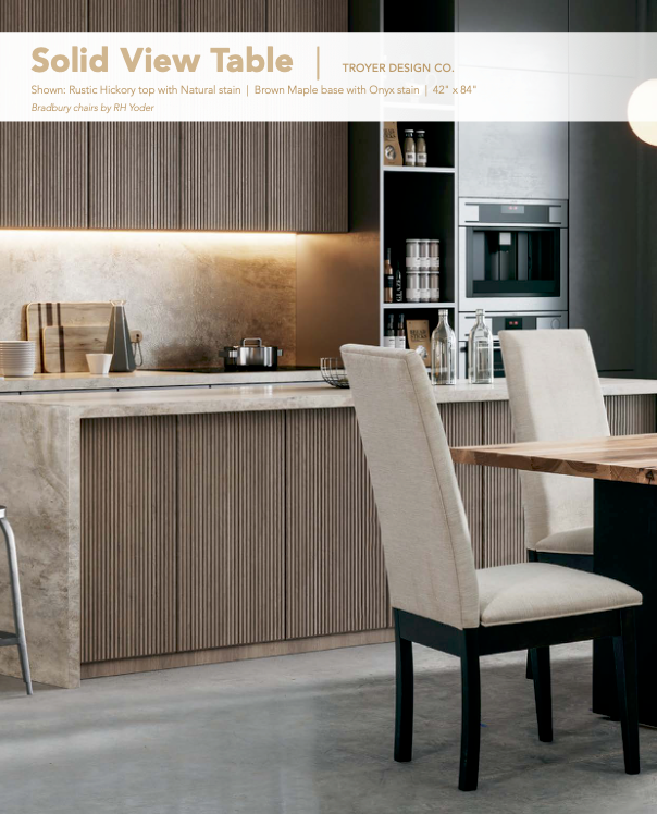 Shown: Rustic Hickory top with Natural stain | Brown Maple base with Onyx stain | 42" x 84" x 1¾" top